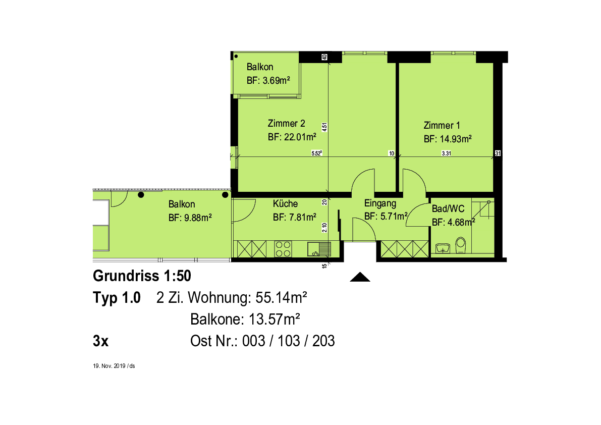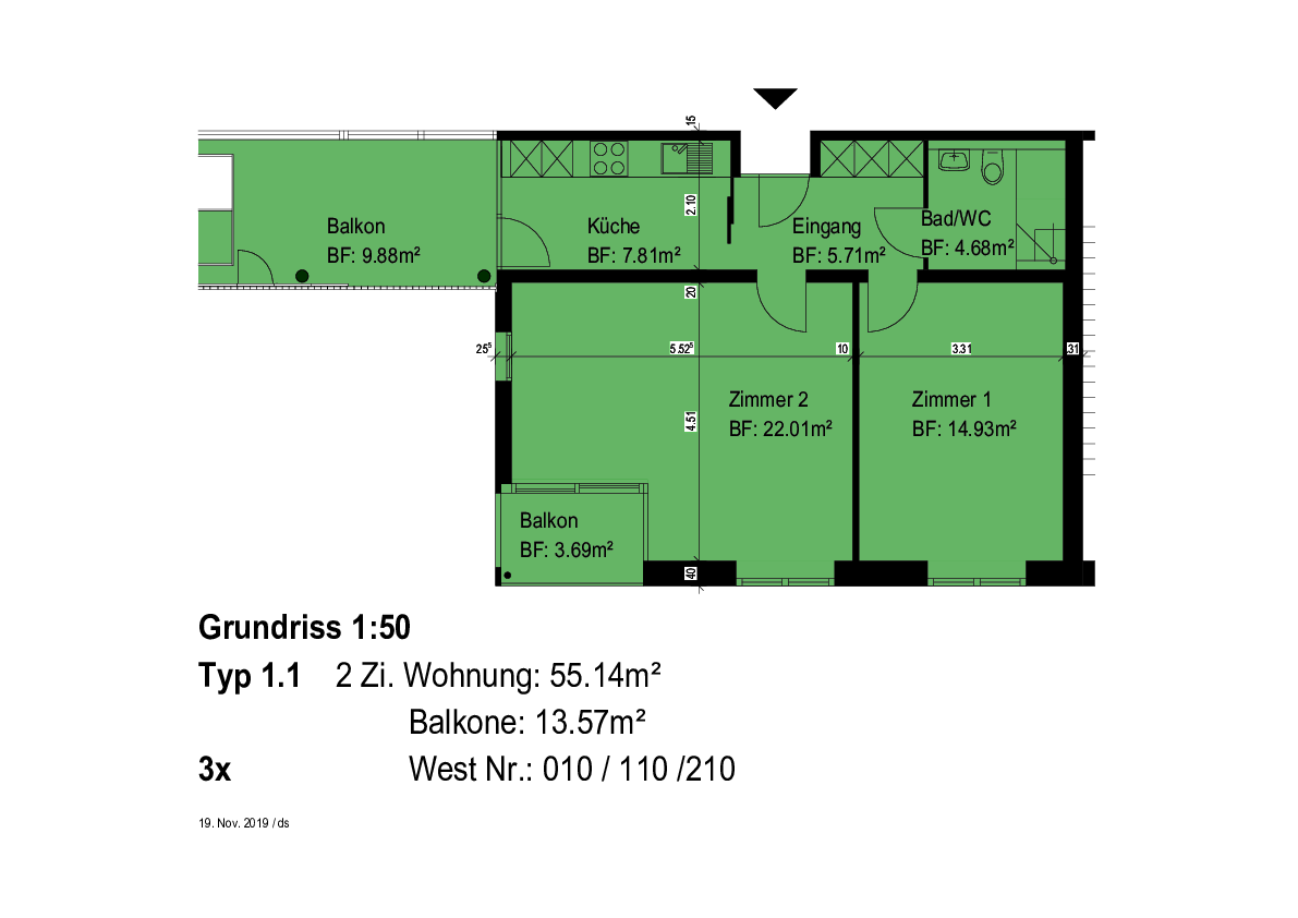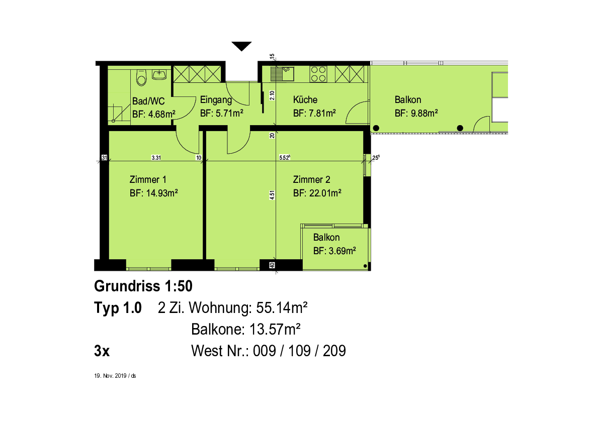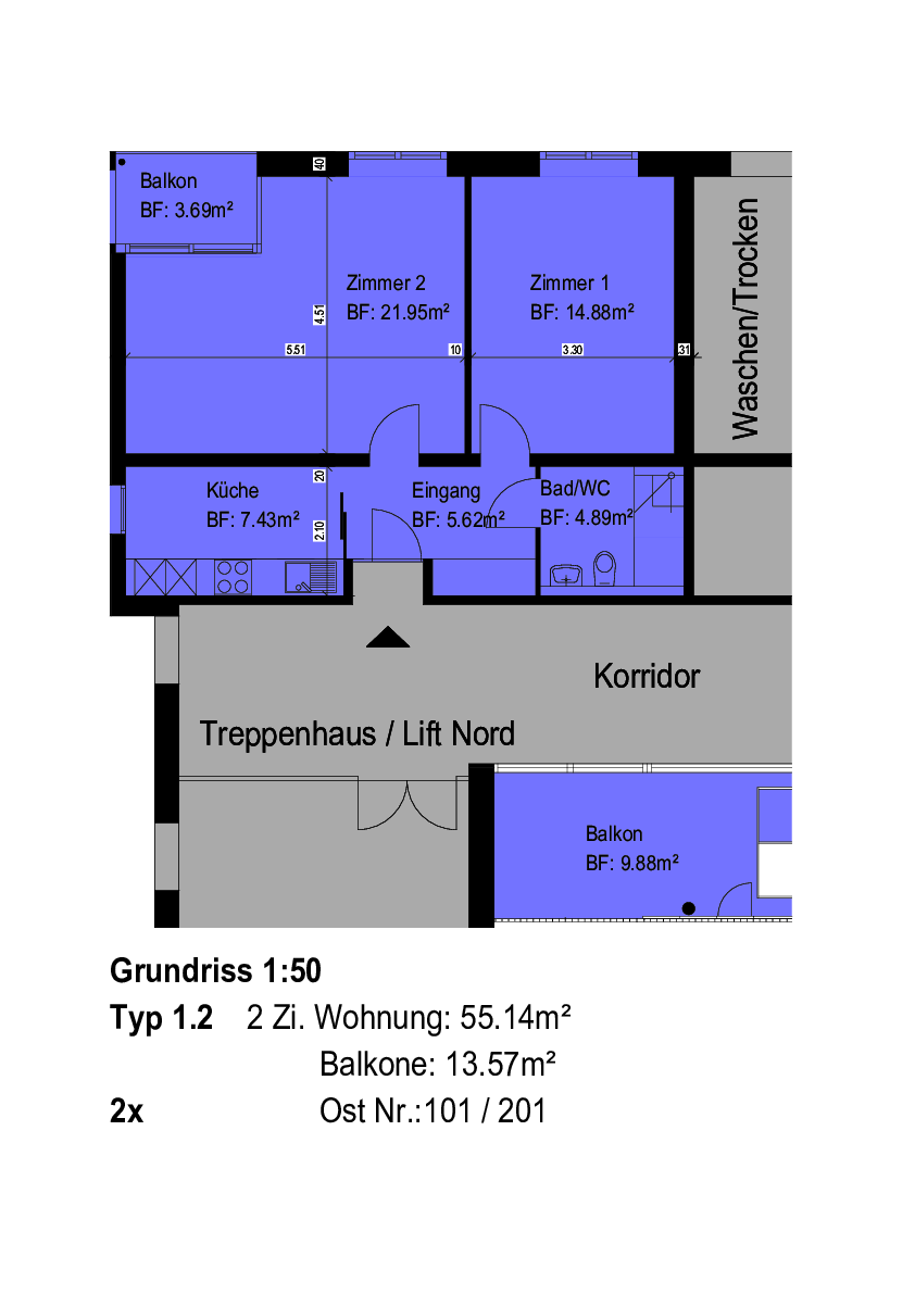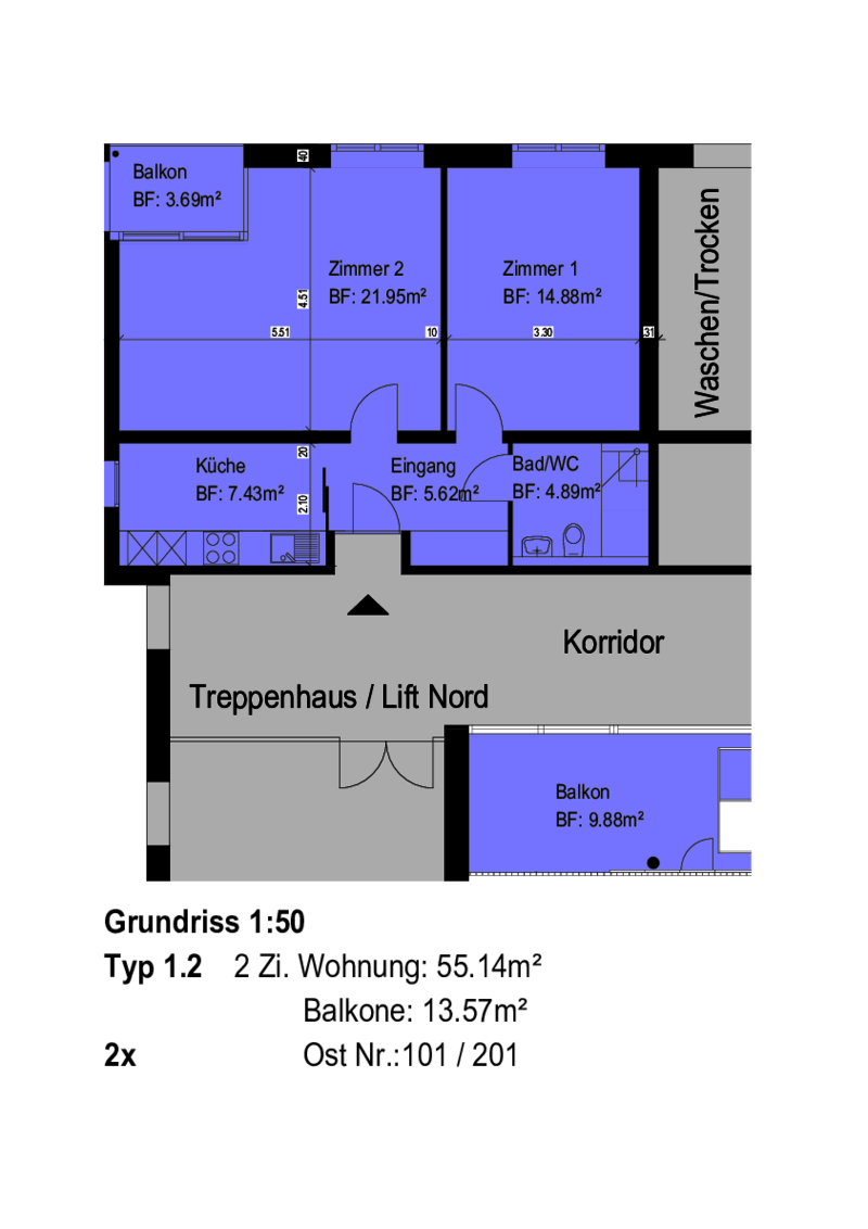 Das Haus beinhaltet 7 Wohnungen des Typs 2.1.